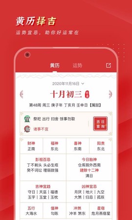 3、在線黃歷擇吉,一鍵查詢運勢和宜忌,隨時幫你選擇出最吉利的日子,讓重要時刻不會錯過!