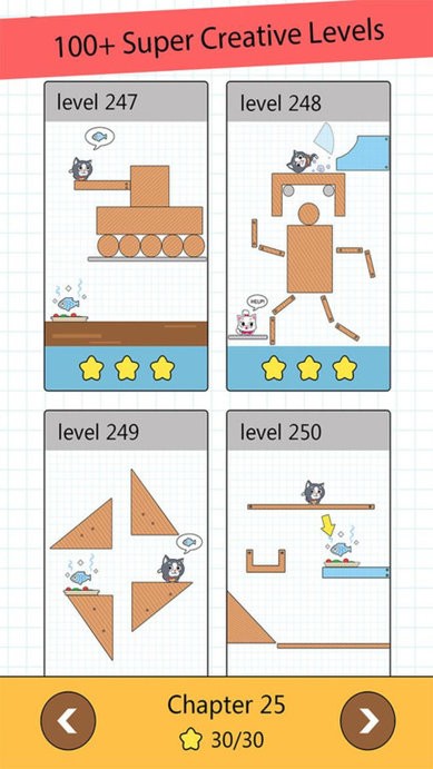 1. 關(guān)卡設(shè)計(jì):游戲中包含超過(guò)100個(gè)精心打磨的關(guān)卡,每個(gè)關(guān)卡都設(shè)計(jì)了獨(dú)特的挑戰(zhàn)和謎題,等待著你去解鎖。通過(guò)剪紙的方式幫助小貓解決難題,這將充分考驗(yàn)?zāi)愕闹腔酆蛣?chuàng)造力。