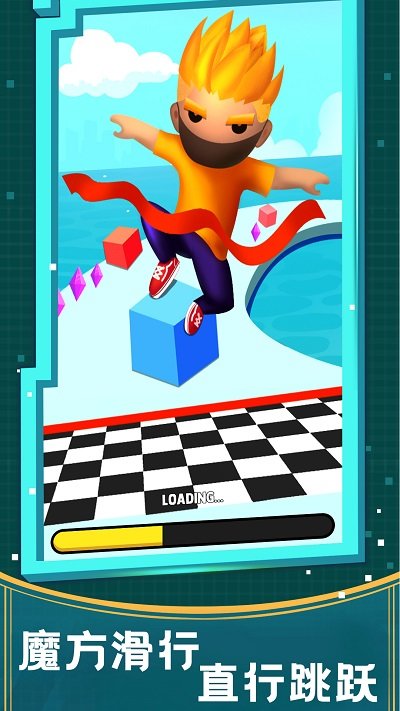 1、游戲的核心玩法就是滑動手指控制角色,在滑行過程中收集方塊和鉆石,跨越障礙物,以獲取更多獎勵,最終抵達終點完成闖關。
